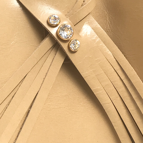 When a customer touches a MONOLISA bag, the first words spoken often are about the ultra-lightness and supreme softness. The video is designer, Lisa Ramos featuring this bag and other pieces from the MONOLISA collection. Tote around town in style with a large Italian leather tan color tote bag. The classic black premium leather bag is perfect for someone on the go. Floppy handbag straps no more. The bag comes with a matching removable leather strap holder that opens and shuts via snap. To add a touch of elegance, the tote is designed with a matching fringe design featuring three sparkling classic clear crystals mounted in gold hardware. The time-less tote comes with a 100% cotton dust bag.