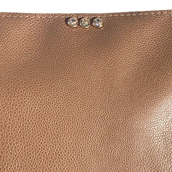 Crafted from scratch-resistant embossed pebble-effect leather sourced from Spain, the bag features three shimmering clear crystal accents mounted in polished gold-tone hardware. The design is finished with a long, thick matching leather detachable strap featuring shiny gold lobster claws. A matching pouch accessory with a crystal detail is included for carrying small essentials. This Bay Area made piece comes with a dustbag and is handmade in California.