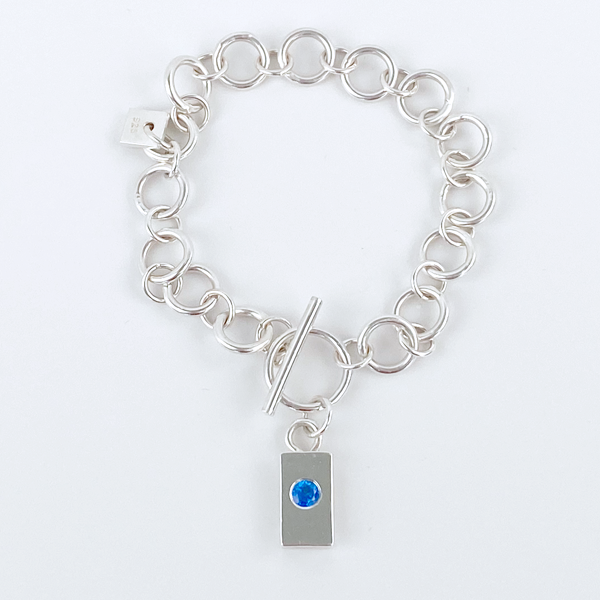 This handmade bold blue topaz sterling chain bracelet with toggle clasp closure is the perfect elegant accessory. The charm bracelet is designed with a bright blue 4mm topaz gemstone. The modern flush setting design beautifully displays the superior cut and clarity of this natural gemstone. The bracelet comes with a fancy gold trim box, white gift box and Sunshine cleaning cloth. For custom pieces email or text Lisa Ramos - 925-301-9600.
