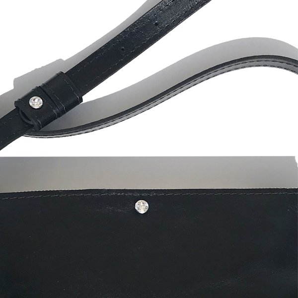 The black Italian square shape leather crossbody bag is ideal for someone on the go. Each timeless MONOLISA bag is hand cut and made by artisan, Lisa Ramos. This strap bag is designed with a black Italian light-weight leather and with the highest quality metal zipper with fully polished elements, YKK's EXCELLA®. The beautiful leather mimics soft luxurious calfskin. The bag has a touch of sparkle featuring a clear crystal mounted in silver hardware on the frontside. The bag comes with a matching leather adjustable detachable strap featuring a crystal on the strap loop and shiny silver hardware. The bag includes a dustbag and is handmade in beautiful Northern California.